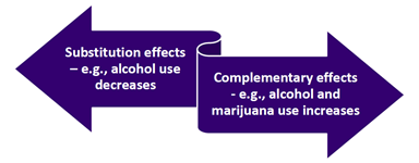 There is evidence that substitution of cannabis for alcohol may occur as a response to policy changes, such as when tax on alcohol is raised.11 Policies that legalize the sale and use of cannabis may result in either substitution (decrease in alcohol, increase in cannabis) or complementary use (increase in both alcohol and cannabis), depending on other characteristics of the group studied.11